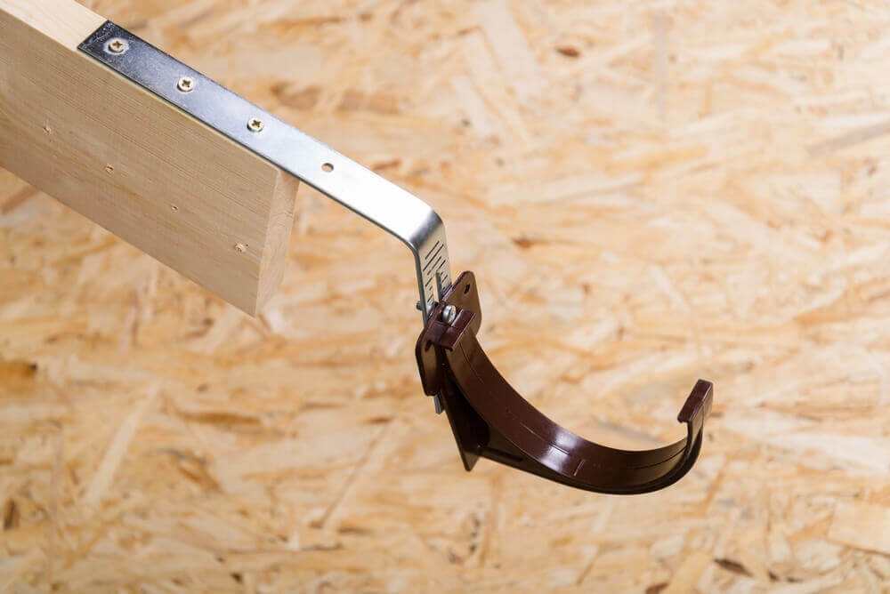 V tomto případě, aby bylo možné upevnit drenážní držáky, jsou dodatečně instalovány kovové nosné prvky. Ve tvaru připomínající písmeno „L“ jsou připevněny přímo ke stěně nebo na straně krokví. K nim jsou již připevněny samotné háky a poté zbývající součásti drenážního systému po celém obvodu střechy.
